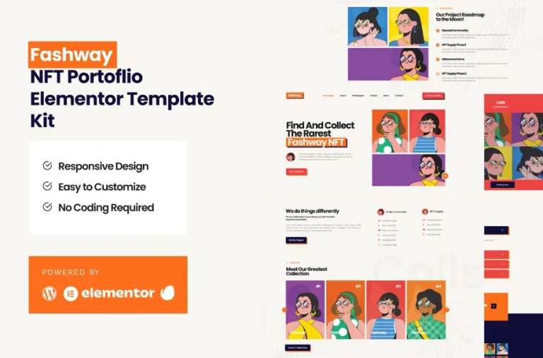 Bienvenido al Kit de Plantillas de Portafolio Fashway NFT. Este kit está diseñado para facilitar tu Proyecto de Página de Aterrizaje NFT. Está equipado con una colección elegante, héroe, preguntas frecuentes, hoja de ruta, contacto, y más. Este no es un tema de WordPress. Los Kits de Plantillas contienen contenido de página para el constructor de páginas Elementor. Este kit ha sido optimizado para ser utilizado con el tema gratuito Hello Elementor, pero puede ser utilizado con la mayoría de los temas que admiten Elementor.