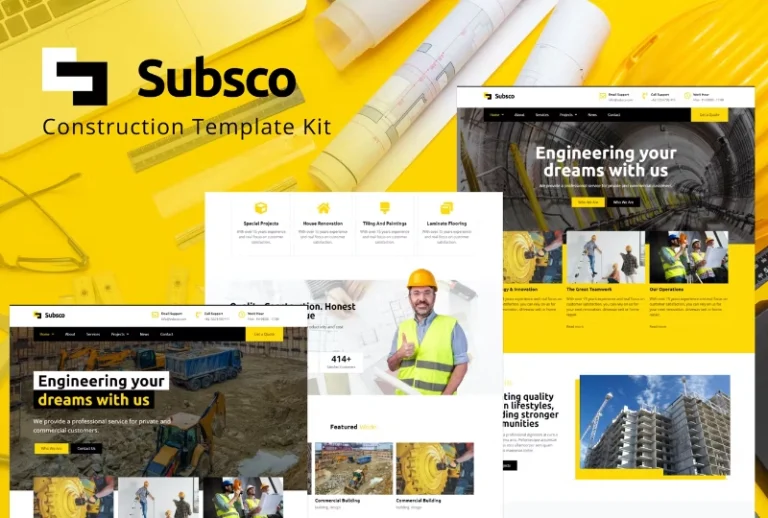 Subsco es un Kit de Plantillas de Elementor limpio, moderno y creativo. Está diseñado para empresas de construcción, construcción, renovación y servicios de contratistas de remodelación o negocios que desean mostrar su trabajo, servicios y profesionalismo. Esta plantilla tiene un diseño hermoso y único que se adaptará mejor a su presencia web en línea. Tiene un diseño 100% responsivo y ha sido probado en todos los dispositivos móviles principales.