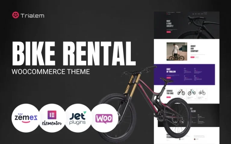 Presenta tus servicios de alquiler de bicicletas de la manera más elegante e atractiva con el tema Trialem. Hay páginas predefinidas, como Inicio, Acerca de, Bicicletas, Servicios y Contactos, donde podrás mostrar la información necesaria para los visitantes. Este tema cuenta con una interfaz conveniente y un diseño moderno. Podrás informar sobre tu empresa, las condiciones para alquilar una bicicleta, ofertas especiales y mostrar bicicletas disponibles y reseñas de clientes satisfechos. Además, podrás agregar un formulario de contacto para que las personas puedan dejar sus datos para solicitar una llamada. El tema Trialem ofrece una funcionalidad potente, presentada por los plugins Jet para el construidor de páginas Elementor. El plugin JetThemeCore permitirá crear encabezados, pies de página y páginas especiales personalizadas fácilmente. Con el plugin JetElements obtendrás un conjunto de útiles widgets para crear varios tipos de contenido y presentar información de manera atractiva. Usando el plugin JetTabs podrás organizar el contenido en pestañas compactas y bloques de acordeón bien estructurados sin necesidad de conocimientos de codificación. El plugin JetBlocks te ayudará a implementar funcionalidades adicionales a los encabezados y pies de página en unos pocos clics. Trialem es un tema receptivo y fácil de usar, que será una buena opción para aumentar la popularidad de tu empresa de alquiler de bicicletas.