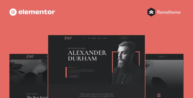 Alexander Durham es un kit completo de sitio web para Elementor que te permite crear de manera rápida y sencilla un sitio web completo de Elementor Pro para tu Portfolio, Fotografía o sitio web de ICO. Está optimizado para el tema gratuito Hello Elementor pero se puede utilizar con la mayoría de los temas que admitan el constructor de páginas Elementor. Personaliza fuentes y colores a través de los controles de Estilos del tema de Elementor integrados y carga tus fotos, logotipos y contenido usando el constructor visual de arrastrar y soltar.