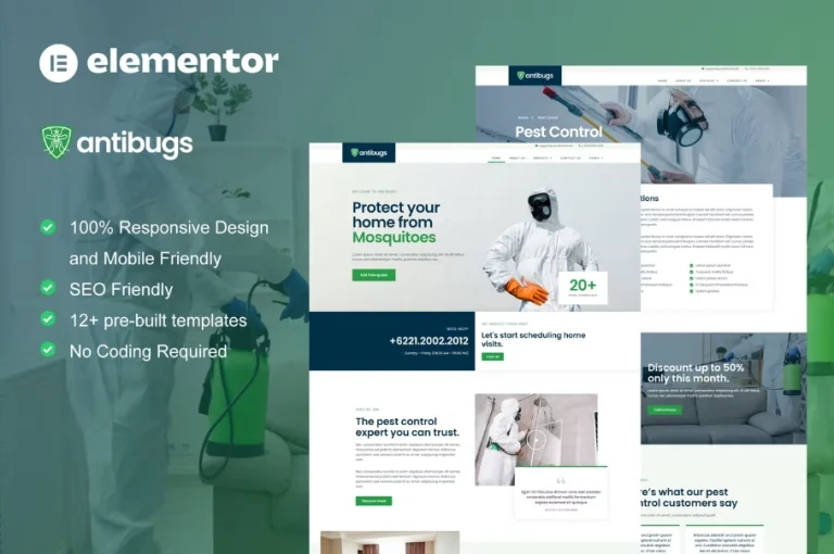 Antibugs es un Kit de Plantillas de Elementor para un sitio web de servicios de control de plagas. Este kit de plantillas te ayudará a crear cualquier sitio web relacionado con servicios de control de plagas, como control de plagas, control de mosquitos, control de roedores, control de chinches y cualquier otro tipo de servicios relacionados con el control de plagas. Cuenta con más de 12 plantillas preconstruidas con un diseño limpio y estilo moderno.