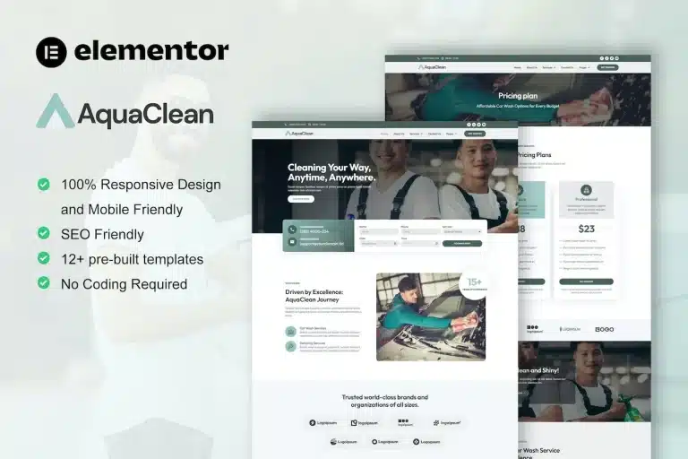 AquaClean es un Kit de Plantillas para Elementor Pro diseñado para sitios web de Servicios de Lavado y Limpieza de Autos. Incluye 12 plantillas preconstruidas con un diseño moderno y estilo limpio. Este kit de plantillas está listo para ser utilizado para negocios y servicios relacionados con Servicios de Lavado y Limpieza de Autos.