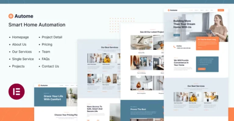Autome es un moderno kit de plantillas Elementor Pro para automatización de hogares inteligentes que es perfecto para crear un sitio web para servicios de automatización de hogares inteligentes, dispositivos para hogares inteligentes, soluciones de seguridad para el hogar y cualquier otro negocio relacionado con la tecnología. Esta plantilla tiene un diseño elegante y único con un diseño 100% responsivo, listo para retina y fácil de personalizar.