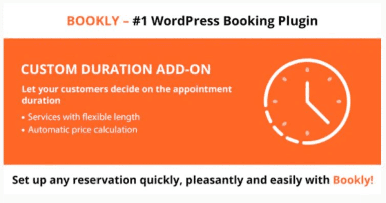 El plugin Bookly Custom Duration permite a tus clientes tener un mayor control sobre sus reservas al elegir la duración de sus citas. Esta característica es especialmente útil para servicios que pueden requerir más tiempo que la duración predeterminada, como reuniones o conferencias. Cuando los clientes reservan servicios con duración flexible, pueden seleccionar la duración de su cita al principio del proceso de reserva en el formulario de Bookly, y el precio se calculará en consecuencia. Brinda a tus clientes la libertad de personalizar sus reservas con el complemento Bookly Custom Duration.