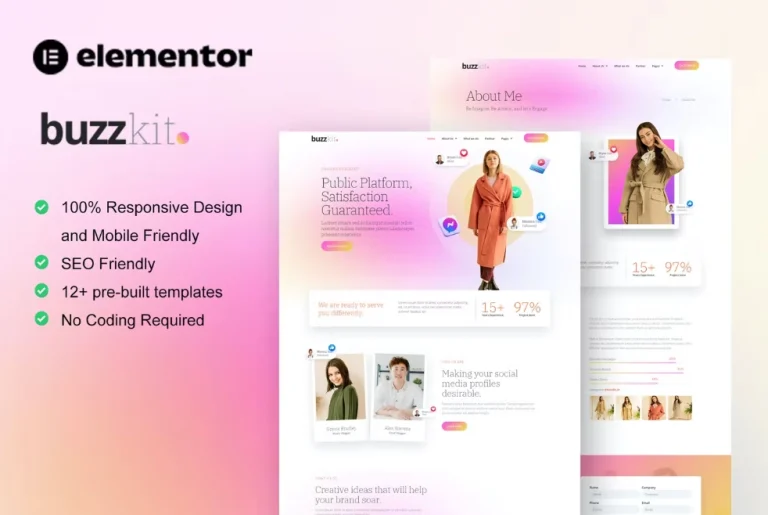 Buzzkit es un Kit de Plantilla de Elementor para el sitio web de una agencia creativa e influencer. Esta plantilla tiene un aspecto limpio, moderno, simple y profesional. Puedes construir fácilmente un sitio web moderno que ofrezca servicios creativos de una agencia de talentos e influencer, tanto para empresas personales como establecidas.
