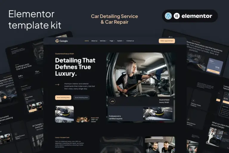 Haz que tu negocio automotriz brille tanto como los vehículos que entregas. Careglo – Car Detailing Service & Car Repair Elementor Template Kit es una colección de recursos de diseño web pulida y profesional, desarrollada específicamente para estudios de detallado automotriz (Auto Detailing), talleres mecánicos, centros de reparación y especialistas en cuidado del automóvil.