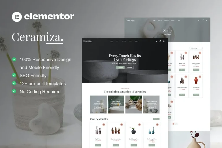 Ceramiza es un Kit de Plantilla de Elementor para el sitio web de cerámica y decoración de cerámica. Este kit de plantilla te ayudará a crear cualquier sitio web relacionado con una tienda de cerámica y decoración de cerámica. También puedes usar este kit de plantilla de Elementor para cualquier sitio web de decoración, tienda de diseño de interiores, tienda de muebles utilizando WooCommerce + Elementor. Tiene más de 12 plantillas preconstruidas con un diseño limpio y estilo moderno.