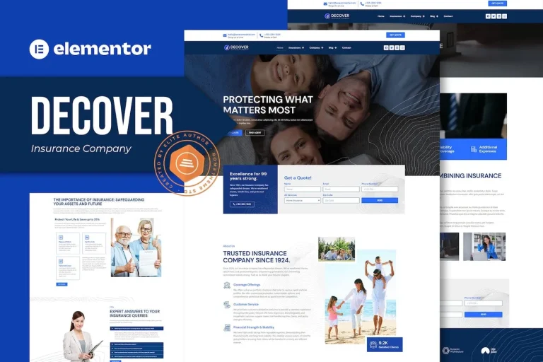 Decover es un Kit de Plantillas de Elementor Pro con una selección ideal de plantillas para sitios web de seguros y negocios. Este kit tiene un diseño moderno y único con un diseño totalmente receptivo del 100%, una instalación fácil y seguramente muy fácil de personalizar porque utiliza Elementor, ¡así que no necesitas ni una sola línea de código!