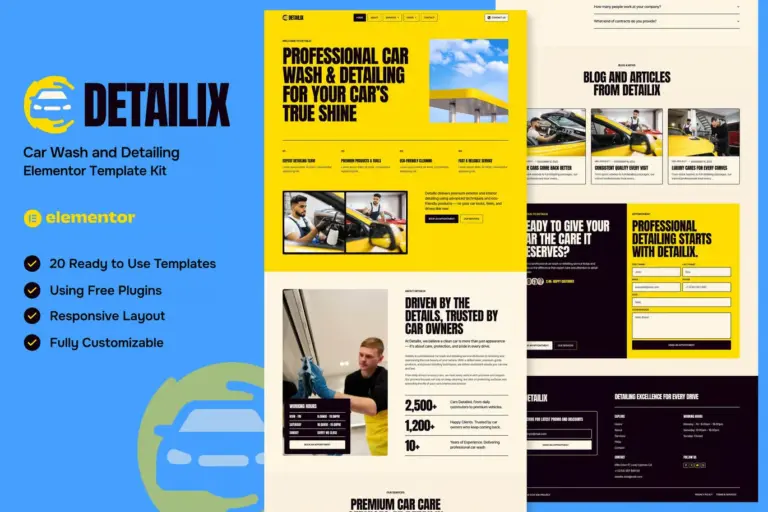 En la industria del cuidado automotriz, la estética lo es todo. Un cliente que busca un tratamiento cerámico o un lavado profundo para su vehículo espera perfección, brillo y atención al detalle. Si tu sitio web luce descuidado, lento o desorganizado, estás contradiciendo la promesa básica de tu servicio. Detailix – Car Wash and Detailing Service Elementor Template Kit es la solución de diseño web desarrollada para que centros de lavado, estudios de detailing y servicios de estética vehicular proyecten una imagen tan pulida y brillante como los coches que entregan.