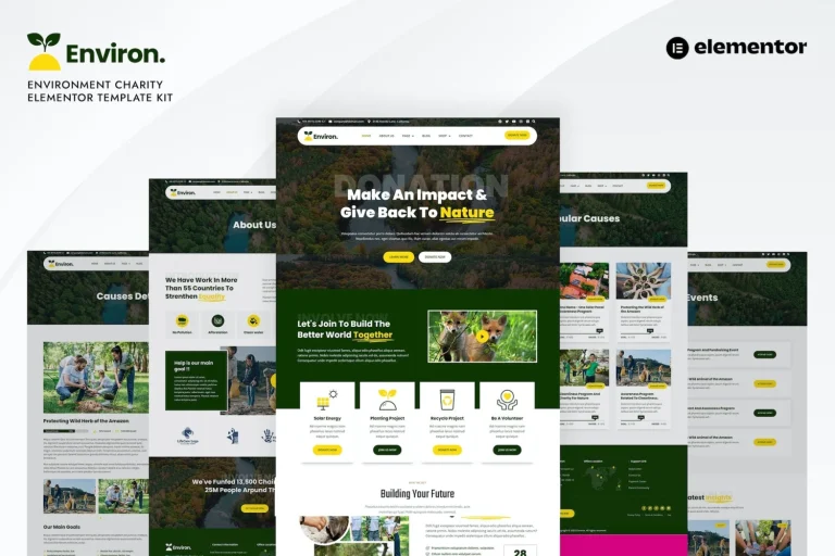 Environ – Plantilla de Kit de Elementor de Caridad Ambiental creada especialmente para construir sitios versátiles como energía, reciclaje, caridad, crowdfunding, recaudación de fondos, tierra, ecológico, medio ambiente y todos los demás sitios web ambientales sin una sola línea de código.