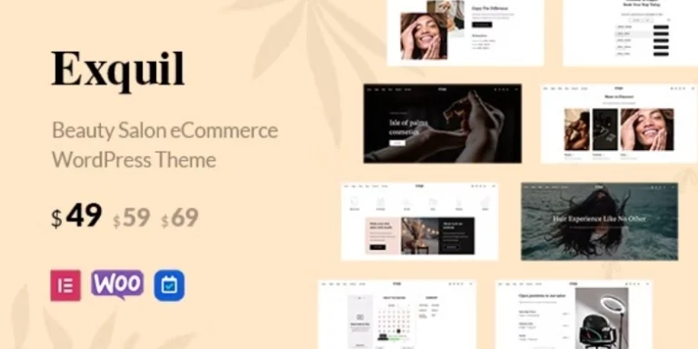 Exquil es un tema de WordPress para salones de belleza, spa, tiendas de cosméticos y tratamientos de bienestar, que incluye una selección sorprendente de plantillas de eCommerce, tiendas de cosméticos, fragancias, spa, clínicas de belleza, salones de uñas y estilistas, lo que lo convierte en una elección ideal para cada sitio web de belleza. Incluye páginas de servicios únicas que se adaptarán a sus requerimientos de servicio, además de páginas únicas y especialmente dedicadas como – Equipo, Precios, Tratamientos, Ubicación, Contacto, Marcas de Productos, Propuestas de Regalos, Paquetes, muchas páginas de Reserva y todo lo demás necesario para crear con éxito un sitio web de belleza. El tema no se limita solo a la belleza y podría adaptarse fácilmente para adaptarse a una amplia gama de aplicaciones.