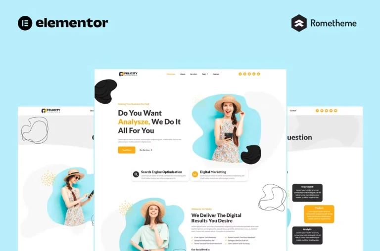 Felicity es un Kit completo de sitio de Elementor para crear rápidamente y fácilmente un sitio web completo de Elementor Pro para tu sitio web de SEO y Marketing Digital. Está optimizado para el tema gratuito Hello Elementor pero puede ser utilizado con la mayoría de los temas que soportan el constructor de páginas Elementor. Personaliza fuentes y colores a través de los controles de Estilos de Tema de Elementor integrados y carga tus fotos, logotipos y contenido usando el constructor visual de arrastrar y soltar.
