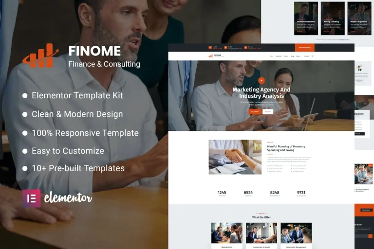 El kit de plantillas Finome Elementor es el más adecuado para Finanzas, Negocios, Empresas de Consultoría, Seguros, Préstamos, Ayuda Tributaria, adaptado a tus necesidades y las expectativas de tus clientes.
