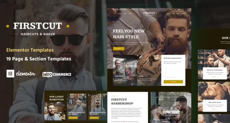FirstCut es un kit de plantillas de Elementor especialmente diseñado para barberías y negocios relacionados con el cuidado masculino que cuenta con 19 plantillas de página y sección predefinidas. Este kit de plantillas de Elementor ha sido optimizado para su uso con el tema gratuito Hello Elementor, pero puede ser utilizado con la mayoría de los temas que admiten Elementor.