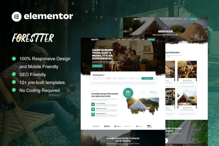 Forestter es un Kit de Plantilla de Elementor para sitios web de Camping y Aventura. Este kit de plantilla te ayudará a crear cualquier sitio web relacionado con el camping, la aventura al aire libre, el senderismo, la experiencia en la naturaleza, parques, campamentos de lujo, viajes, glamping y cualquier negocio o servicio que ofrezca actividades al aire libre. Tiene 12+ plantillas preconstruidas con un diseño limpio y estilo moderno.