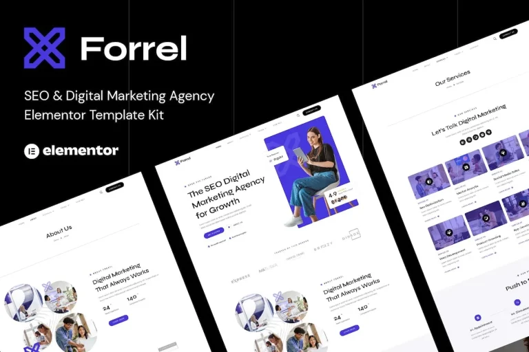 Forrel – Kit de plantillas de Elementor para agencias de SEO y marketing digital creado especialmente para Agencias de Marketing Digital, Agencias de SEO, Marketing Online, Agencias de Publicidad y otros sitios web de marketing. Forrel tiene un diseño simple, moderno y limpio con un diseño completamente receptivo, y muy fácil de personalizar y puede ser utilizado por cualquier persona sin necesidad de entender de programación.