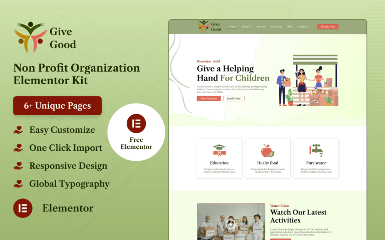 Give Good – Non Profit Organization Elementor Kit está diseñado para ayudar a las organizaciones sin fines de lucro a crear un sitio web impactante que comunique su misión y maximice su presencia en línea.