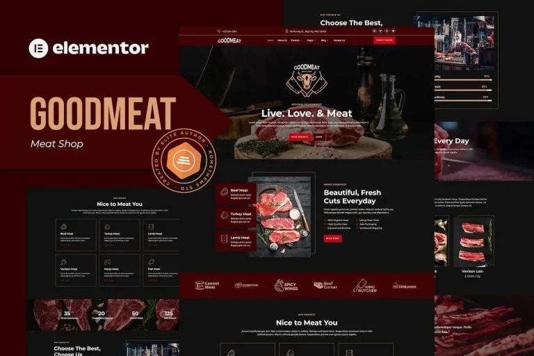 Goodmeat – Kit de plantillas de Elementor para tiendas de carne y carniceros. Gaice tiene 13+ plantillas pre-diseñadas con un diseño limpio, totalmente receptivo y personalizable. Goodmeat puede ser utilizado para tiendas de carne, steak houses, tiendas de alimentos, verdulerías, restaurantes y todo lo relacionado con tiendas y restaurantes de alimentos crudos. Goodmeat también incluye diseños para carteras para mostrar sus proyectos geniales, hermosos y sorprendentes.