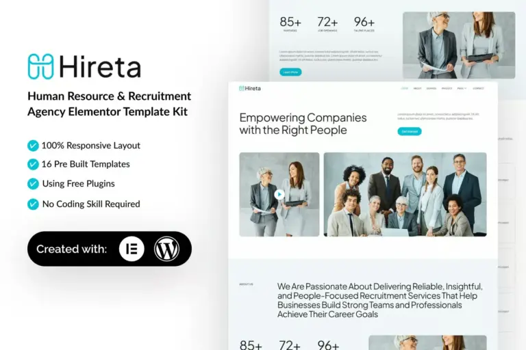 Conecta el mejor talento con las empresas líderes a través de una plataforma digital que inspira profesionalismo y eficiencia. Hireta – Human Resource & Recruitment Agency Elementor Template Kit es una colección de recursos de diseño web moderna y limpia, desarrollada específicamente para agencias de recursos humanos, consultoras de reclutamiento, headhunters y empresas de dotación de personal.