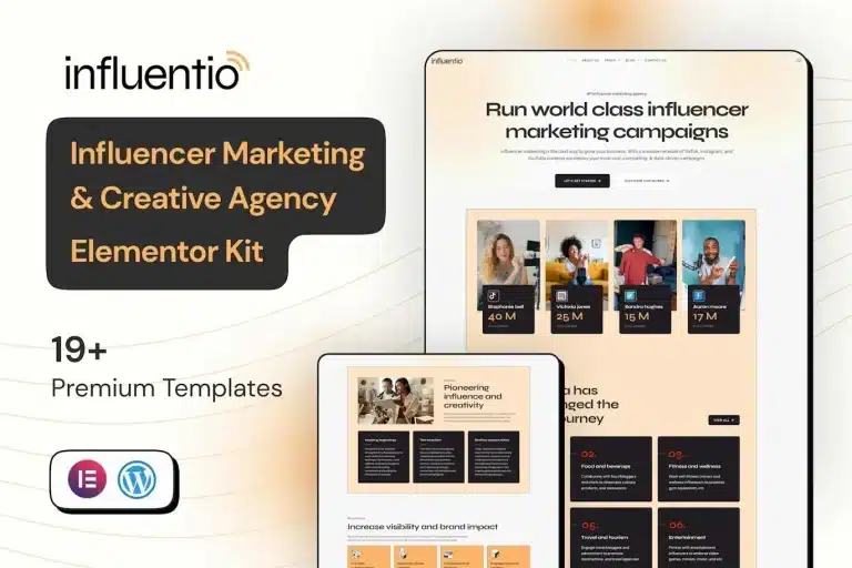 Influentio es un Kit de Plantillas de Elementor Pro diseñado para catapultar la presencia en línea de tu agencia de marketing de influencia y agencia creativa a un nivel superior. Esto no es un tema de WordPress. Los Kits de Plantillas contienen contenido de página para el constructor de páginas Elementor. Este kit ha sido optimizado para su uso con el tema gratuito Hello Elementor, pero puede ser utilizado con la mayoría de los temas que soportan Elementor.