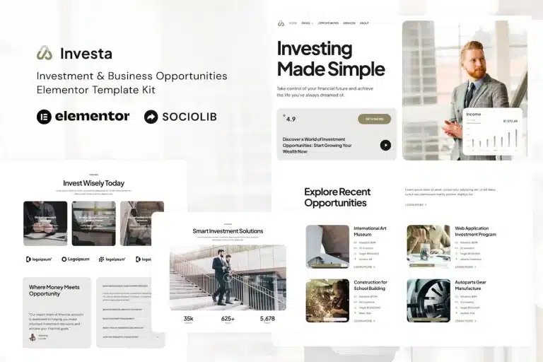 Investa es un conjunto de plantillas Elementor diseñado para crear de manera rápida y sencilla un sitio web relacionado con inversiones y oportunidades de negocio utilizando el plugin Elementor Page Builder en WordPress. Es adecuado para temas como inversiones, negocios, oportunidades, finanzas, consultoría, activos, capital, financiamiento, empresas, entre otros. Dale un toque moderno y creativo a tu sitio web de WordPress con este kit de plantillas y dale un aspecto fresco a tu blog.