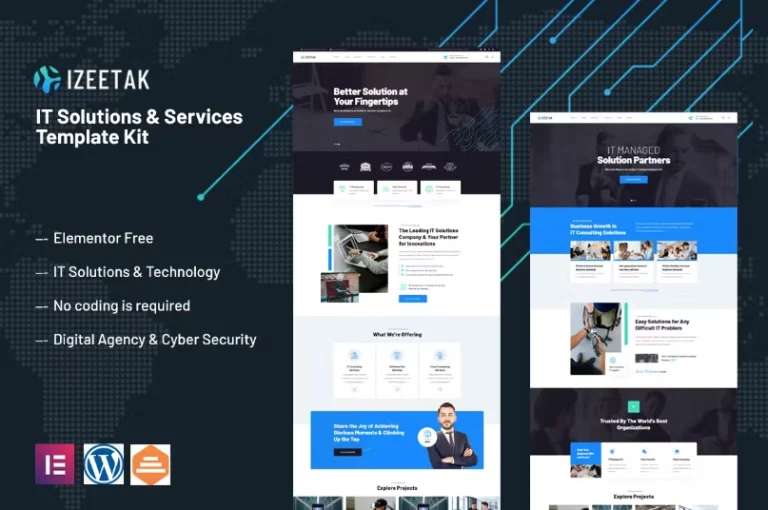 Izeetak Template Kit es una solución tan receptiva y poderosa para Agencias, Negocios, Consultorías, Creativos, Ciberseguridad, Desarrollo, Agencias Digitales, Hosting, Servicios de TI, Soluciones de TI, Marketing, Software, Startups, Tecnología, y Tecnología. Izeetak Kit fue creado con Elementor – el mejor sistema constructor de páginas, por lo que no necesitarás habilidades de codificación para usar o configurar plantillas.