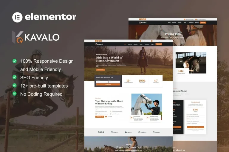 Kavalo es un Kit de Plantillas de Elementor Pro para el sitio web de un club de equitación. Este kit de plantillas también es adecuado para crear cualquier sitio web relacionado con un club de equitación, como el club oficial de equitación, la comunidad de equitación, establos de caballos, cría de caballos, entrenamiento de caballos, actividades al aire libre, club deportivo, etc. Tiene más de 12 plantillas preconstruidas con un diseño limpio y estilo moderno.