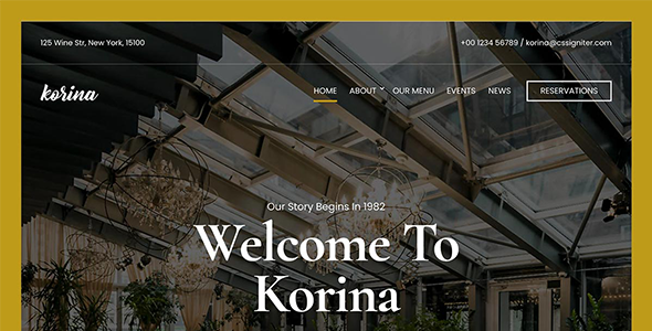 Korina es un tema de WordPress fácil de configurar para bares, restaurantes y cafeterías. Refleja la misión de tu negocio a través de un sitio web elegante y moderno creado con Korina.