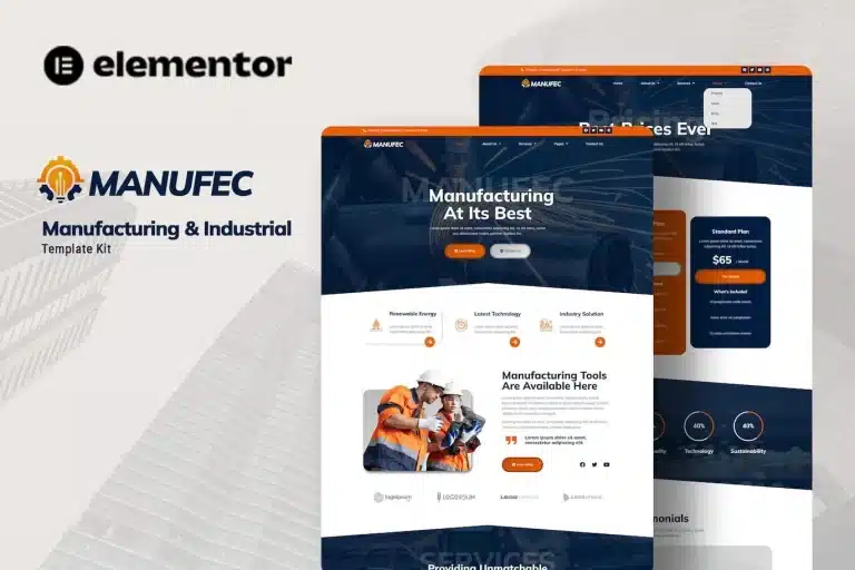 Manufec es un conjunto de plantillas para Elementor destinado a empresas en la industria, manufactura, maquinaria, ingeniería o cualquier industria relacionada. Manufec ofrece diversas páginas, incluyendo Inicio, Acerca de nosotros, Equipo, Servicios, Detalles de Servicios, Precios, Preguntas frecuentes, Blog, 404, Contáctanos.