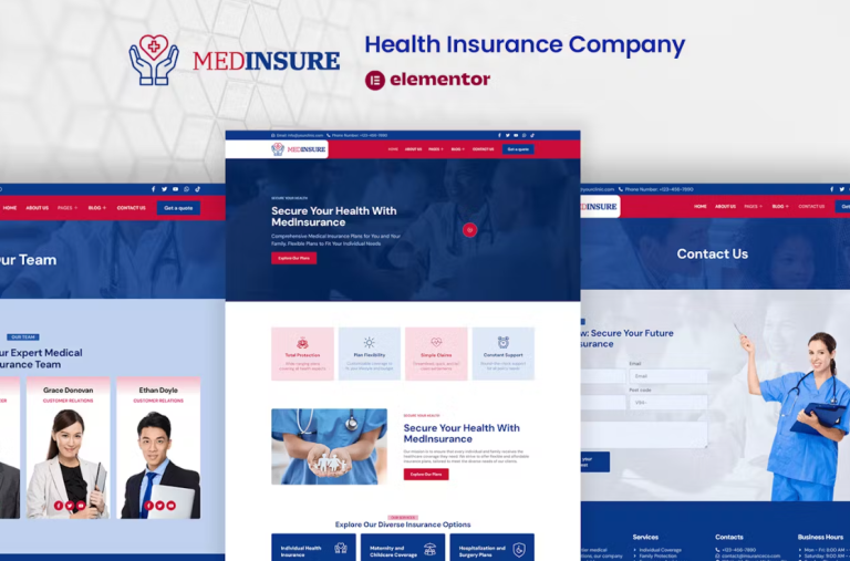 MedInsure – Plantilla de Elementor Pro para Compañía de Seguros de Salud es una colección de diseños de plantillas para el plugin generador de páginas Elementor Pro para crear un sitio web completo para tu Compañía de Seguros de Salud o práctica médica … Con un diseño moderno y profesional. El kit cuenta con un sistema de diseño completamente compatible y una selección de imágenes profesionalmente elegidas para un inicio premium de marca en tu próximo proyecto. Optimizado para su uso con el tema gratuito Hello Elementor, este kit está afinado, carga rápidamente y es completamente receptivo.