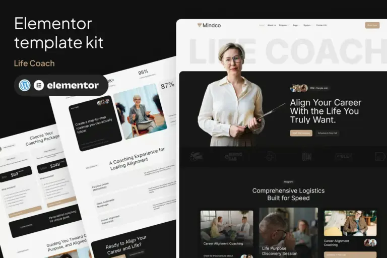 Establece una conexión auténtica con quienes buscan un cambio significativo en sus vidas. Mindco – Life Coach & Counseling Elementor Template Kit es una colección de recursos de diseño web cálida y empoderadora, desarrollada específicamente para coaches personales, mentores de mentalidad, consultores de bienestar y oradores transformacionales.