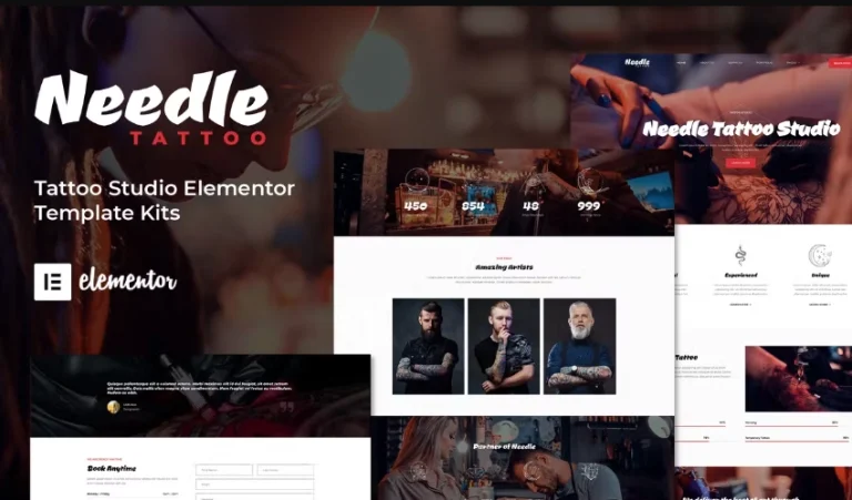 Needle – Tattoo Studio Elementor Template Kits es un tema moderno para todos los sitios web de artistas del tatuaje y estudios de tatuajes, lleno de una impresionante selección de diseños flexibles perfectos para portafolios de tatuajes, presentaciones de artistas del tatuaje y mucho más. Needle tiene un diseño sencillo, moderno y limpio con un diseño totalmente receptivo, y muy fácil de personalizar porque utiliza Elementor, ¡así que no necesitas una sola línea de código!