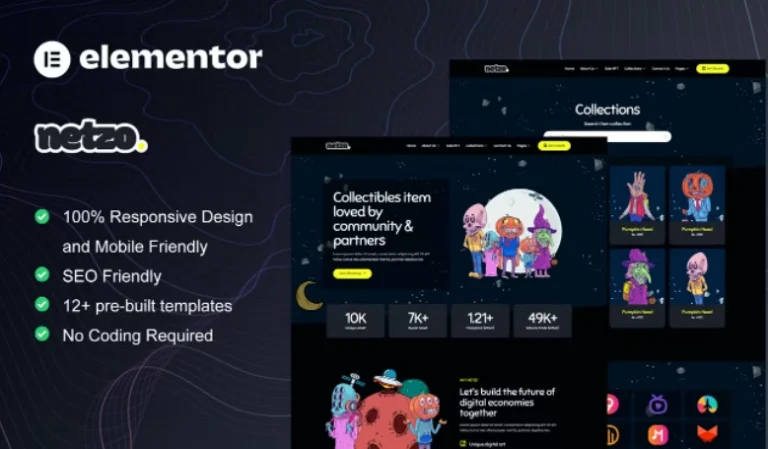 Netzo es un kit de plantillas para Elementor, diseñado para portafolios de NFT y sitios web de artículos digitales. Puedes utilizar este creativo kit de plantillas para portafolios de NFT, cripto-coleccionables, artículos digitales y más. Cuenta con 12 plantillas preconstruidas con un diseño atractivo y un estilo moderno. Fácil de editar y personalizar con la función de arrastrar y soltar.