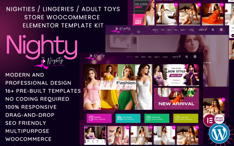 Te presentamos Nighty, un elegante Elementor Template Kit creado especialmente para marcas de lencería de lujo, tiendas de ropa interior, bikinis de moda, ropa de noche glamorosa, sex shops y negocios similares.