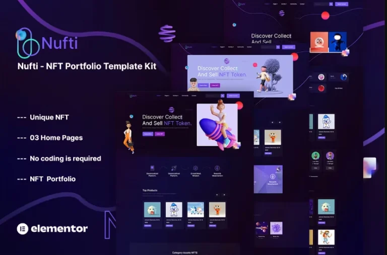 Colecciones Nufti NFT Elementor Pro Template Kit para Activos, Bitcoin, Blockchain, Cripto, Criptomoneda, Digital, Mercado, NFT, Token, Tokens, Virtual, Billetera. El Kit de Plantillas Nufti se utiliza con el plugin de constructor de páginas Elementor Pro, esta plantilla es fácilmente personalizable, completamente receptiva y compatible con todos los navegadores y dispositivos modernos. La plantilla de Marketplace de NFT es un nuevo método de pago en Internet que utiliza moneda electrónica. NFT es un «token no fungible».