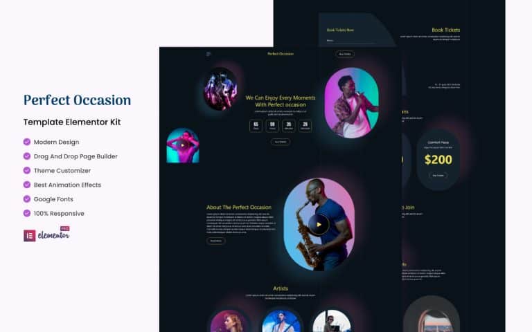 Perfect Occasion Kit es un kit de plantillas Elementor diseñado para eventos musicales. Ofrece secciones para destacar a grandes artistas, horarios de eventos, opciones de hospedaje, servicios de transporte y más. Este kit, estéticamente atractivo, no requiere conocimientos técnicos para su creación.