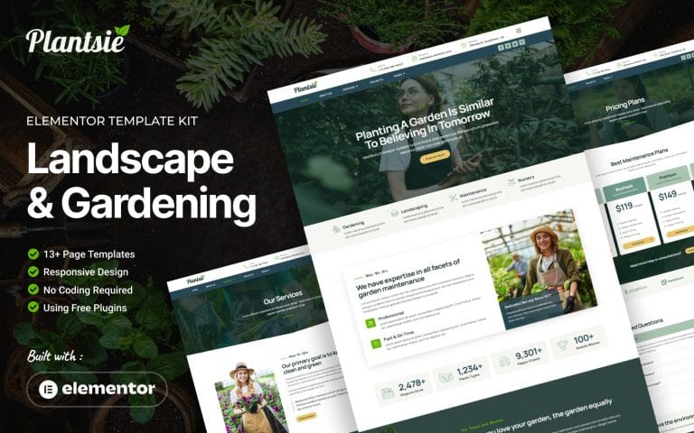 Plantsie es un kit de plantillas web pensado para negocios de paisajismo, jardinería y mantenimiento de césped. Incluye más de 12 diseños prediseñados para que crees un sitio web atractivo y moderno sin necesidad de saber programar. Es una herramienta fácil de usar que te ayudará a destacar tus servicios de manera profesional.