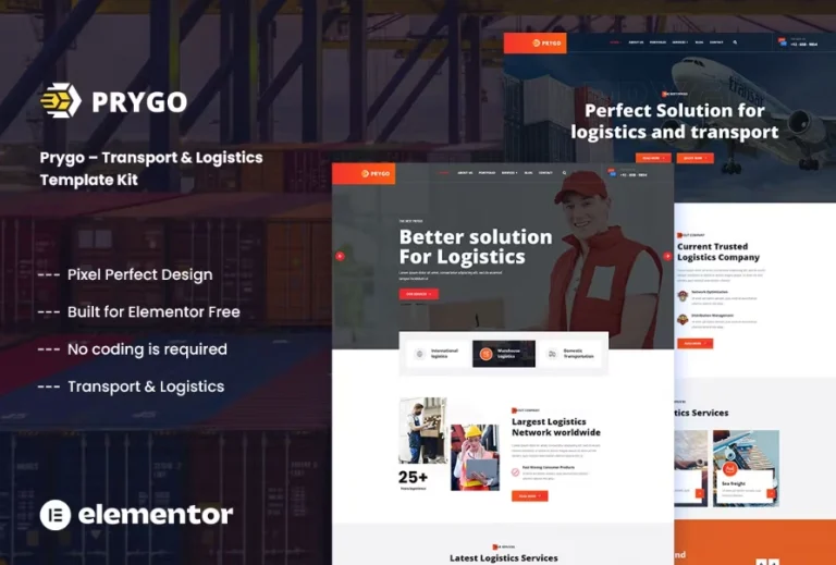 Prygo es un kit de plantillas de Elementor muy versátil para Transporte y Logística. Prygo es el diseño perfecto para empresas que ofrecen servicios de entrega, logística, mudanzas, empresas de mudanzas… También cubre los servicios de embalaje, empresas de carga corporativa, empresas de elevación y transporte, etc. ¡Nuestro complemento personalizado proporciona funcionalidades adicionales y elementos para crear deslizadores y pestañas dinámicas con cualquier plantilla!