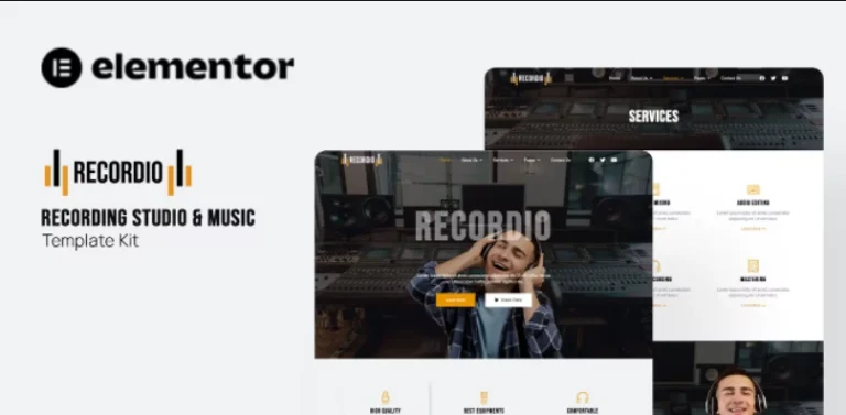 Recordio es un kit de plantillas de Elementor para estudios de grabación y música. Recordio utiliza elementos gratuitos, así que no te preocupes por probarlo. Esto no es un tema de WordPress. Los kits de plantillas contienen contenido de página para el constructor de páginas de Elementor. Este kit ha sido optimizado para su uso con el tema gratuito Hello Elementor, pero puede ser utilizado con la mayoría de los temas que admiten Elementor.