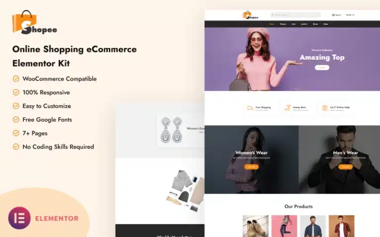 Shopee – Online Shopping E-commerce Elementor Kit es una excelente plantilla para lanzar tu tienda en línea y ofrecer una experiencia de compra excepcional.