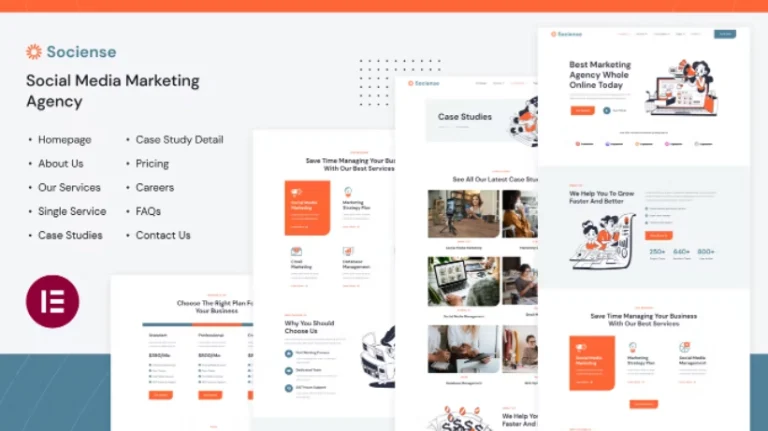 Socience es un moderno kit de plantillas para Elementor de una agencia de marketing en redes sociales que es perfecto para crear un sitio web para una agencia de marketing digital especializada en marketing en redes sociales. Esta plantilla tiene un diseño único y de vanguardia con un diseño 100% receptivo, listo para retina y muy fácil de personalizar utilizando Elementor.