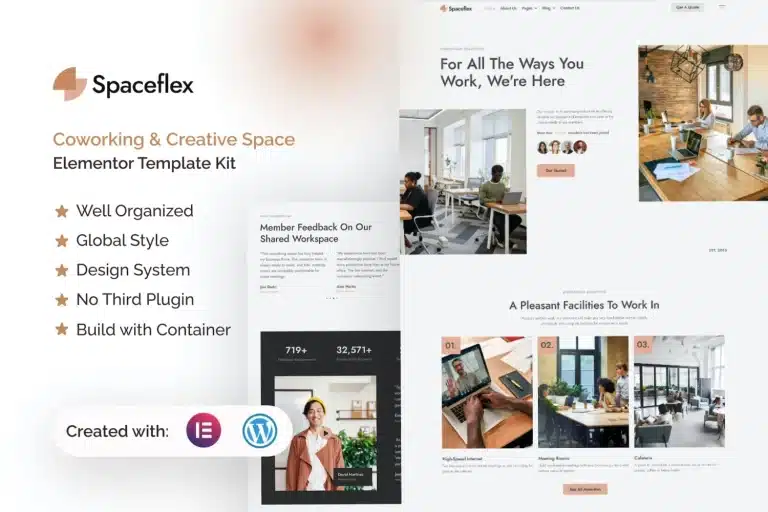 Spaceflex es un kit de plantillas Elementor Pro diseñado para construir sitios web empresariales en WordPress, con el objetivo de elevar tu presencia en línea y optimizar las operaciones de tu negocio. Potenciado por la combinación de Elementor y WordPress, este kit de plantillas es tu boleto para crear un sitio web impresionante que capture perfectamente la esencia de tu espacio de coworking y creatividad.