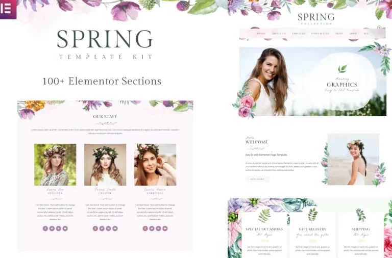 El kit de plantillas de primavera contiene una amplia colección de más de 100 diseños visuales que son compatibles con tu constructor de páginas Elementor. El kit presenta gráficos florales acuarela de alta calidad en rosa, morado y verde. Cada una de estas plantillas predefinidas es completamente personalizable en el editor. Puedes cambiar las fotos y fuentes para que sea único.