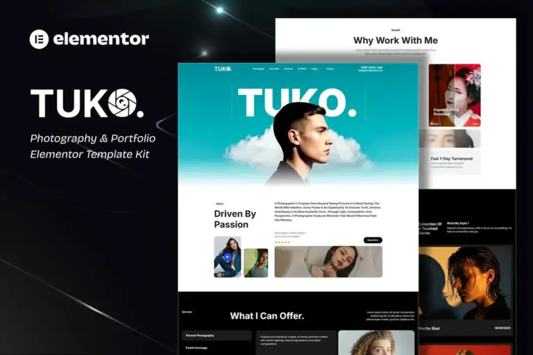 Para un fotógrafo o un artista visual, su portafolio no es solo una colección de trabajos; es su identidad. Un sitio web desordenado o visualmente pobre puede disminuir el valor percibido de tus imágenes, sin importar cuán buenas sean. Tuko – Photography & Portfolio Elementor Template Kit nace como la solución estética definitiva para estudios fotográficos, freelancers y creativos que necesitan un lienzo digital a la altura de su talento, permitiendo que las obras hablen por sí mismas con elegancia y claridad.