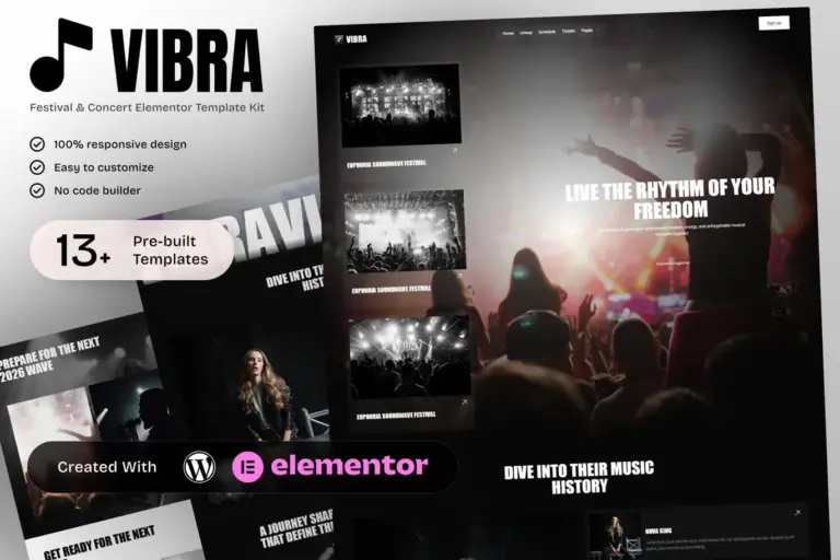 Organizar un evento musical masivo es vender una promesa de adrenalina, conexión y recuerdos inolvidables. Antes de que suene el primer acorde, tu audiencia ya está juzgando la calidad del festival por su sitio web. Si la página es aburrida o difícil de navegar, la venta de entradas se estanca. Vibra – Music Festival & Concert Elementor Template Kit es el amplificador digital que necesitas para transmitir la energía de tu evento, diseñado específicamente para promotores y organizadores que buscan un impacto visual inmediato y una gestión de información impecable.
