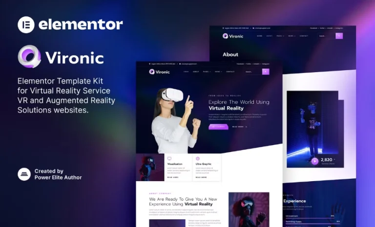 Vironic es un moderno y limpio Kit de Plantillas de Elementor que es perfecto para aquellos que desean crear un sitio web con aspecto profesional para Servicios de Realidad Virtual, VR, Soluciones de Realidad Aumentada, y también es adecuado para una Agencia Digital Creativa y cualquier negocio relacionado. Esta plantilla es compatible con WooCommerce, tiene un diseño 100% receptivo y es muy fácil de personalizar debido a que utiliza Elementor, ¡por lo que no necesitas ni una sola línea de código!