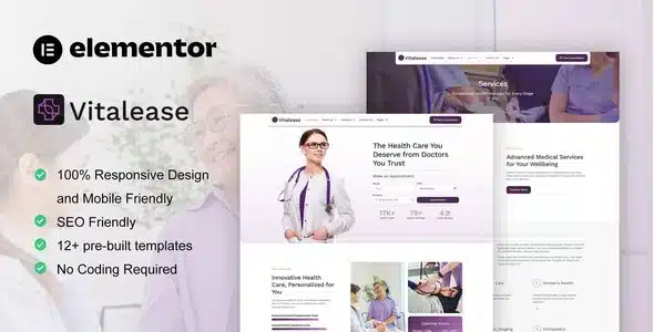 Vitalease Health Care and Medical Elementor Kit es un conjunto de plantillas prediseñadas que facilita la creación de sitios web enfocados en servicios médicos, clínicas, hospitales, laboratorios, consultorios y otras instituciones de salud.