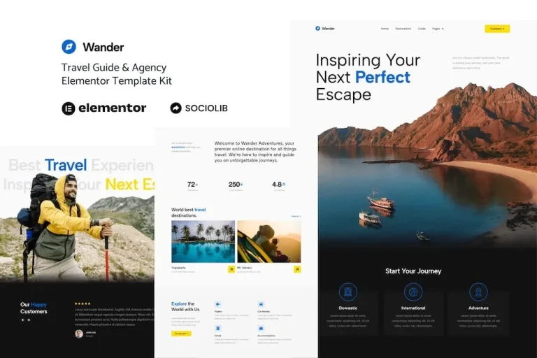 Wander es un Kit de Plantillas de Elementor para crear de manera rápida y sencilla un sitio web de Guía de Viajes y Agencia utilizando el plugin Elementor Page Builder para WordPress. Adecuado para guías de viaje, agencias de viajes, agentes de viajes, vacaciones, aventuras, actividades al aire libre, agencias de tours, viajes, turismo, ofertas y promociones, etc. Estiliza tu sitio web en WordPress con este moderno y creativo Kit de Plantillas para darle un toque moderno a tu blog.