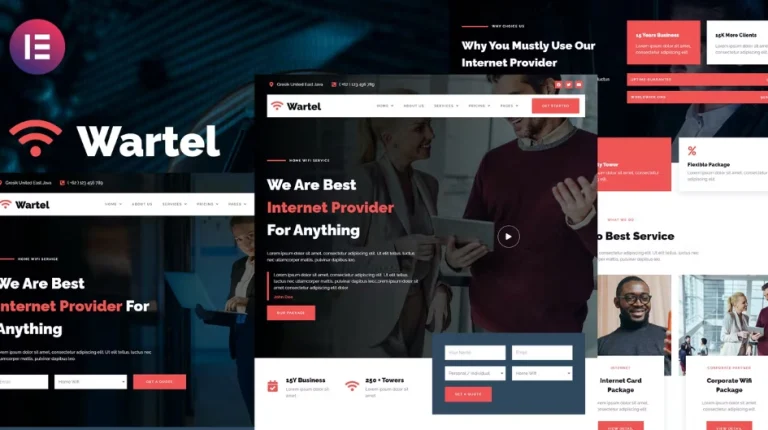 Wartel – Plantilla de Elementor para servicios de proveedor de Wifi y Internet en el hogar es una colección de diseños para el plugin de WordPress Elementor page builder, diseñada para su uso con la versión Pro de Elementor para un diseño limpio. Funciona con la mayoría de los temas y está optimizado para su uso con el tema gratuito Hello Elementor.