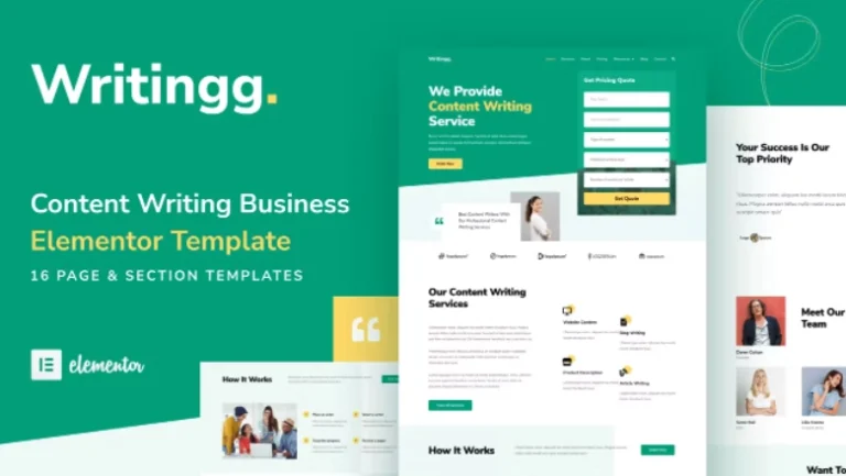 Writingg es un kit de plantilla de Elementor para escritores de contenido o servicios de escritura de contenido que viene con 15 plantillas de páginas y secciones predefinidas. Este kit de plantilla de Elementor ha sido optimizado para su uso con el tema gratuito Hello Elementor, pero puede ser utilizado con la mayoría de los temas que admiten Elementor.